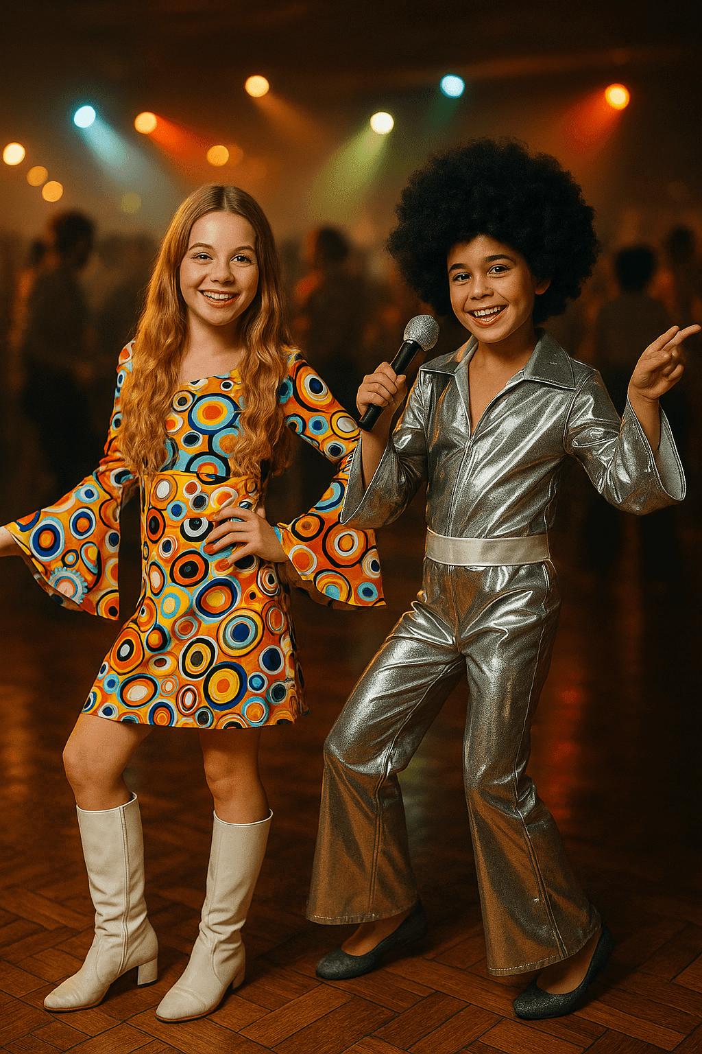 O estilo disco é um dos mais populares quando se trata de fantasias anos 70. Com lantejoulas, calças boca de sino e muito glitter, as meninas adoram o visual colorido e animado. Aposte em tecidos brilhantes, sapatos de plataforma (adaptados para crianças) e acessórios como óculos grandes e faixas de cabelo.
