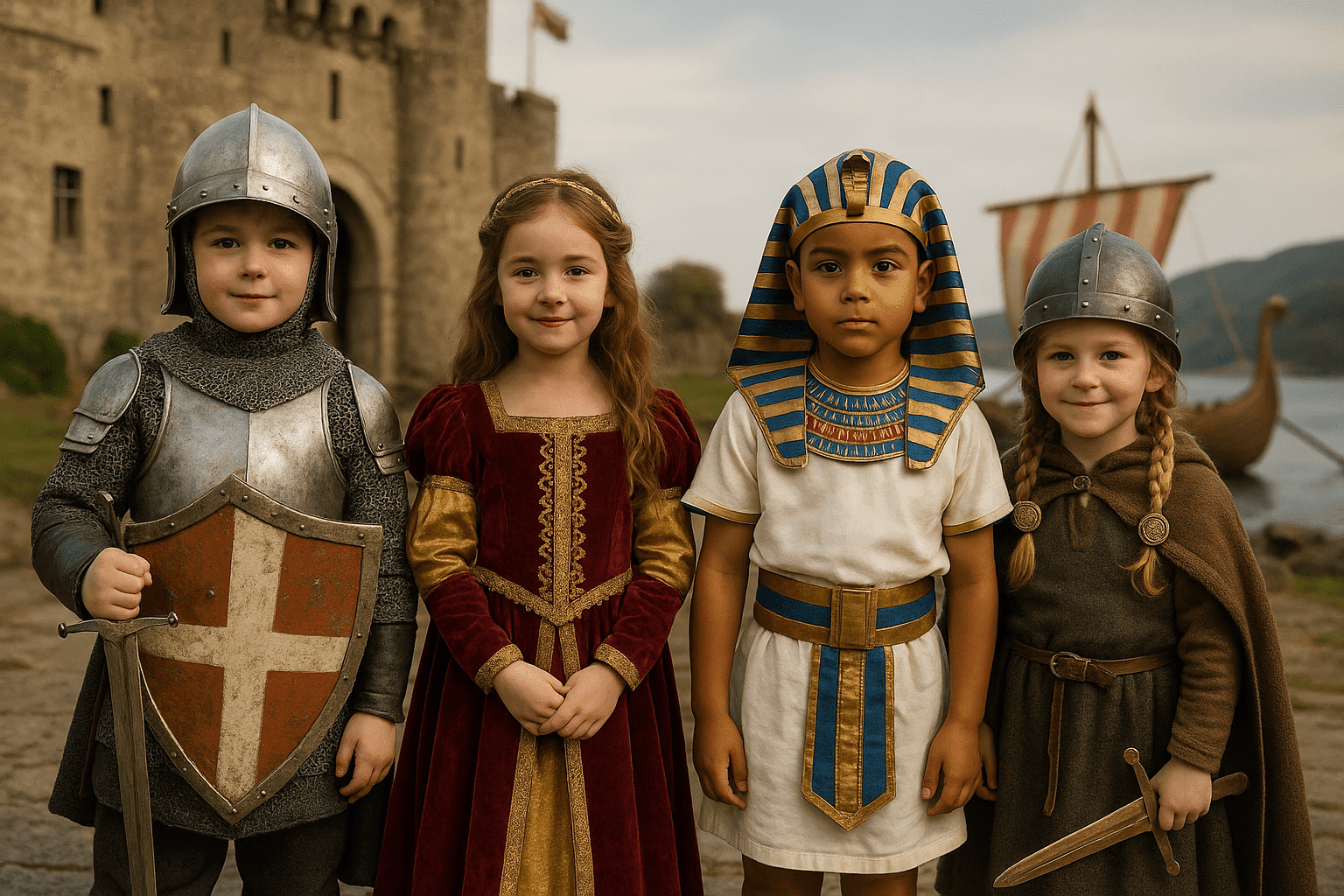 Use o figurino para ensinar história: Aproveite o interesse da criança para falar sobre as civilizações antigas.