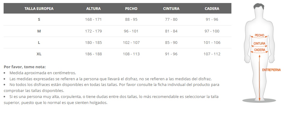 Este disfraz está disponible en talla única adulto. El tejido flexible y el corte amplio lo hacen cómodo y fácil de llevar. Consulta nuestra guía de tallas si necesitas más información.