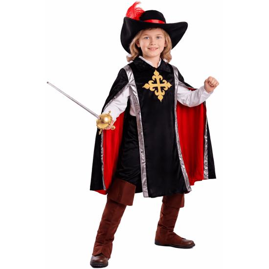 Com sua capa preta com forro vermelho e detalhes prateados, além do icônico chapéu com penas, este traje de época para meninos garante um visual espetacular que não passará despercebido. Ideal para quem busca uma fantasia chamativa, confortável e fácil de vestir.